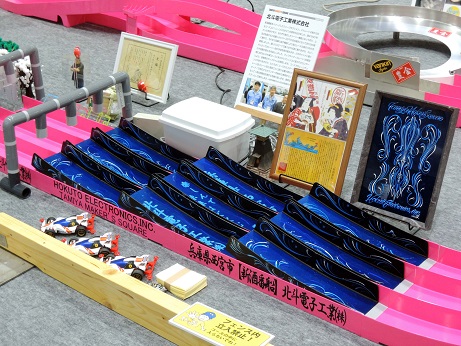 会場では、当社含む12社が持ち寄ったパーツを組み合わせた世界に一つのミニ四駆コースが出来上がりました。
